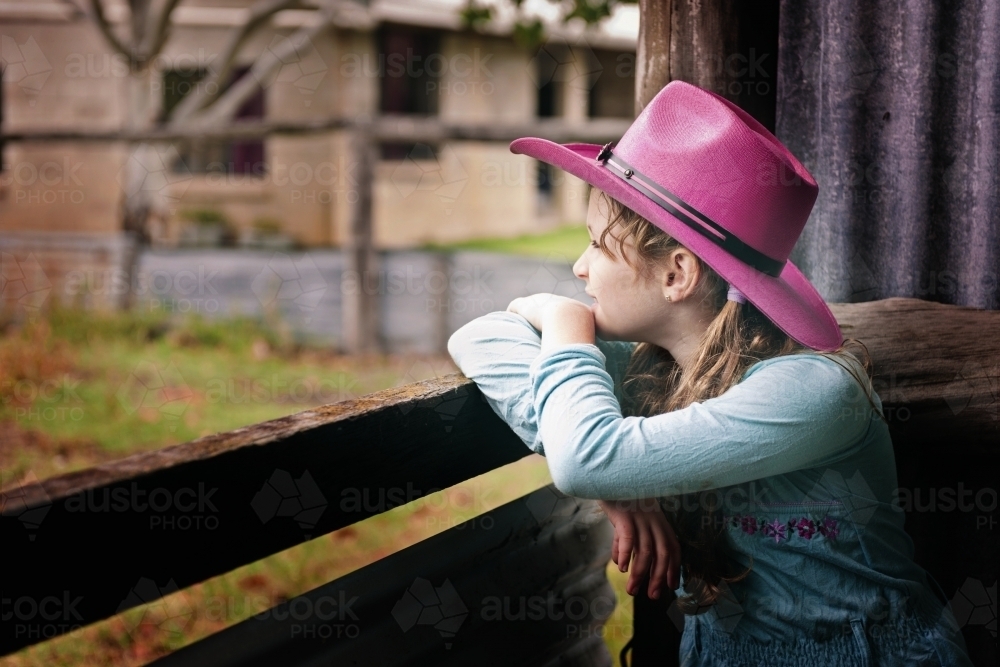 Image of Tween cowgirl looking out from a shed - Austockphoto